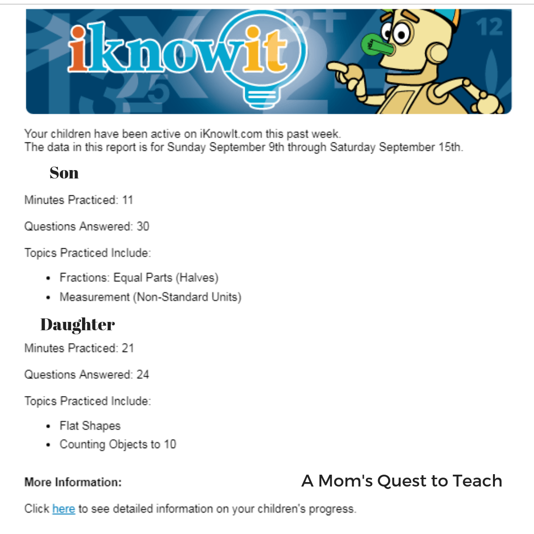 We receive a progress report via email so we know what our children are working on during the week. There are also progress reports online available to the student so they can review the problems. The report is broken down by lesson.